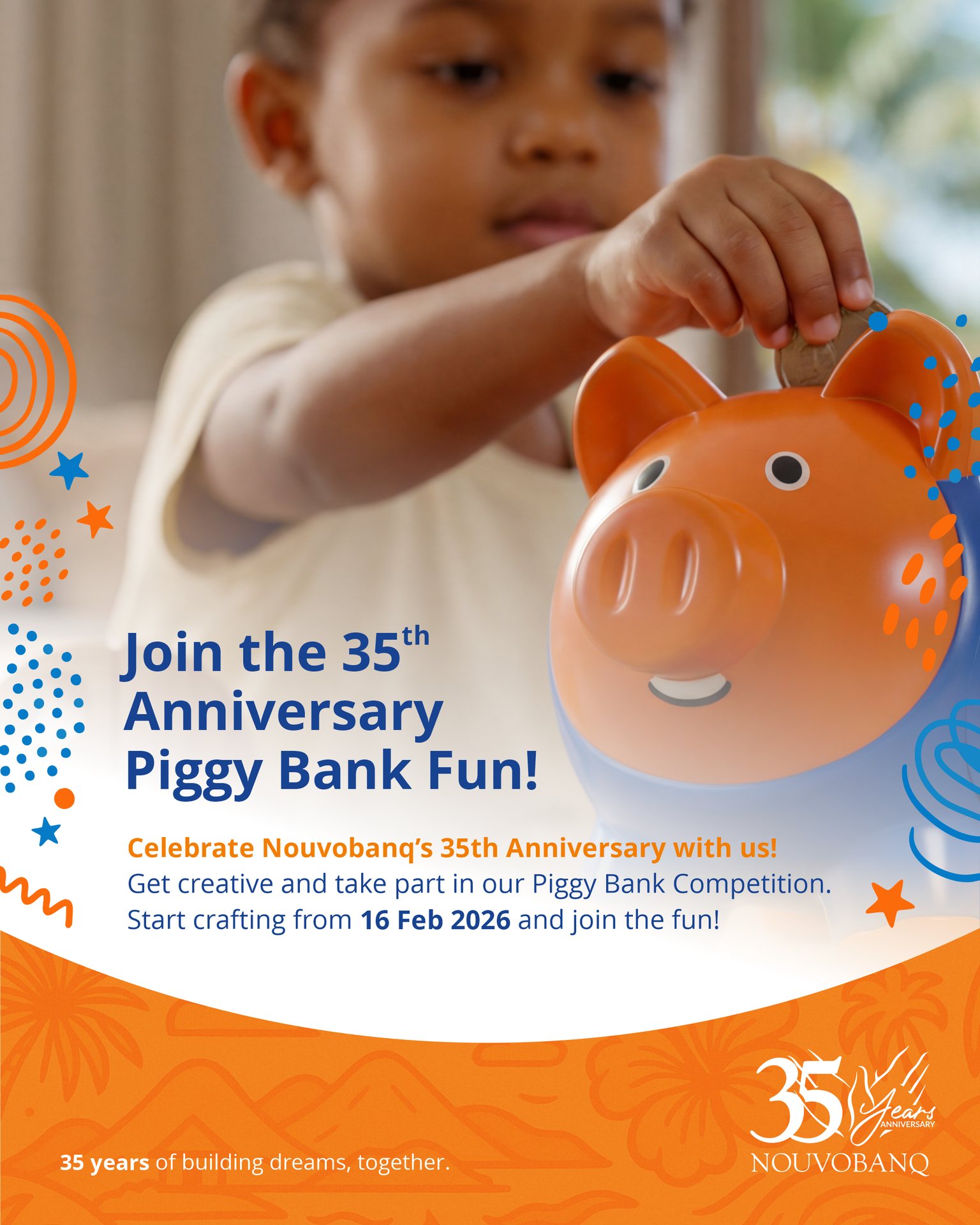 The piggy bank must align with the theme of saving, financial awareness, or Nouvobanq’s 35th Anniversary.